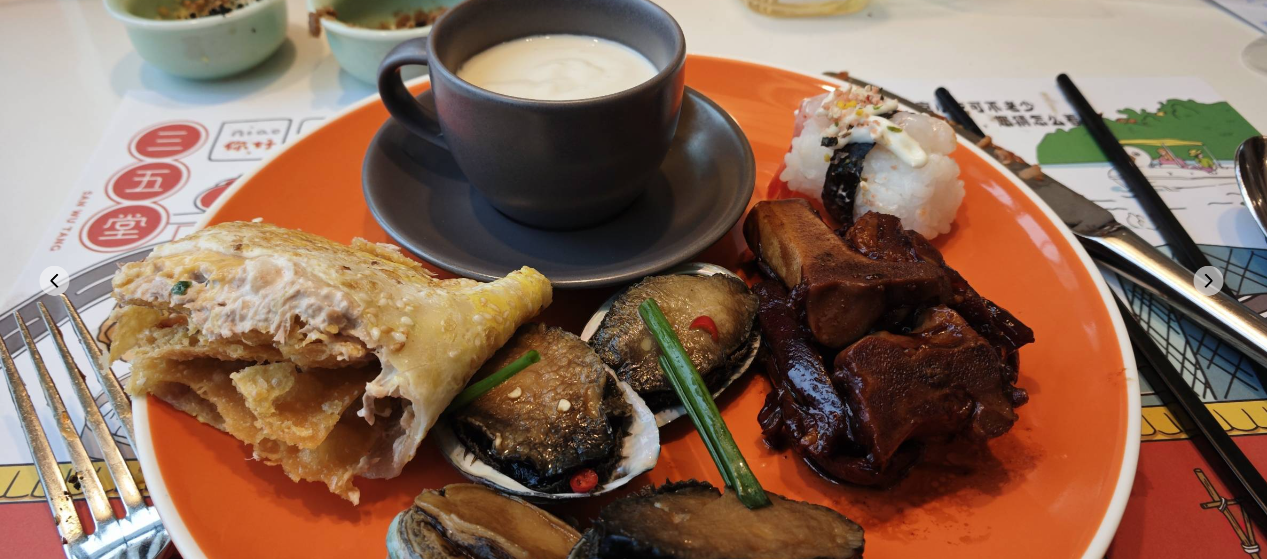 这个是我第一轮拿的东西 两个松花小肚煎饼+烤羊排+面茶+咖啡油炒面